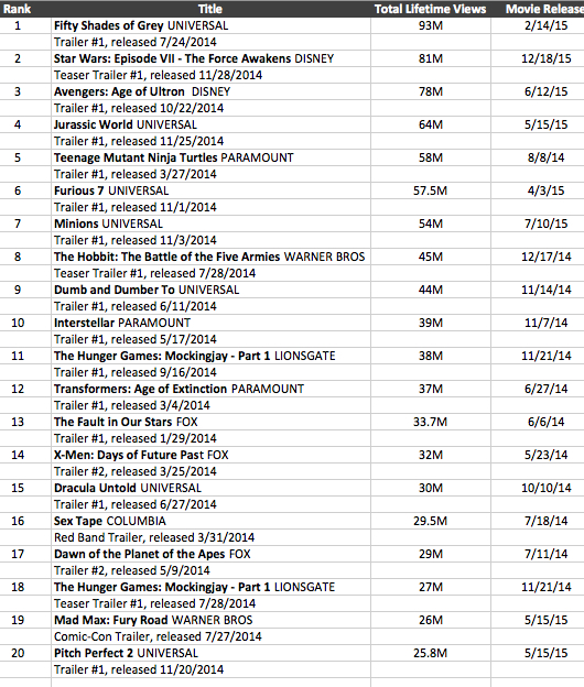 Como cada año por estas fechas, es hora de mirar hacia atrás y realizar un recuento de lo que nos ha dado el año. Es por esto que el portal Hollywood Reporter ha elaborado una lista de los 20 tráilers más vistos a lo largo de este 2014. Entre ellos encontramos que la gran mayoría pertenecen a adaptaciones o a nuevas entregas de aclamadas sagas, aunque el primero no es otro que el de ’50 sombras de Grey’.